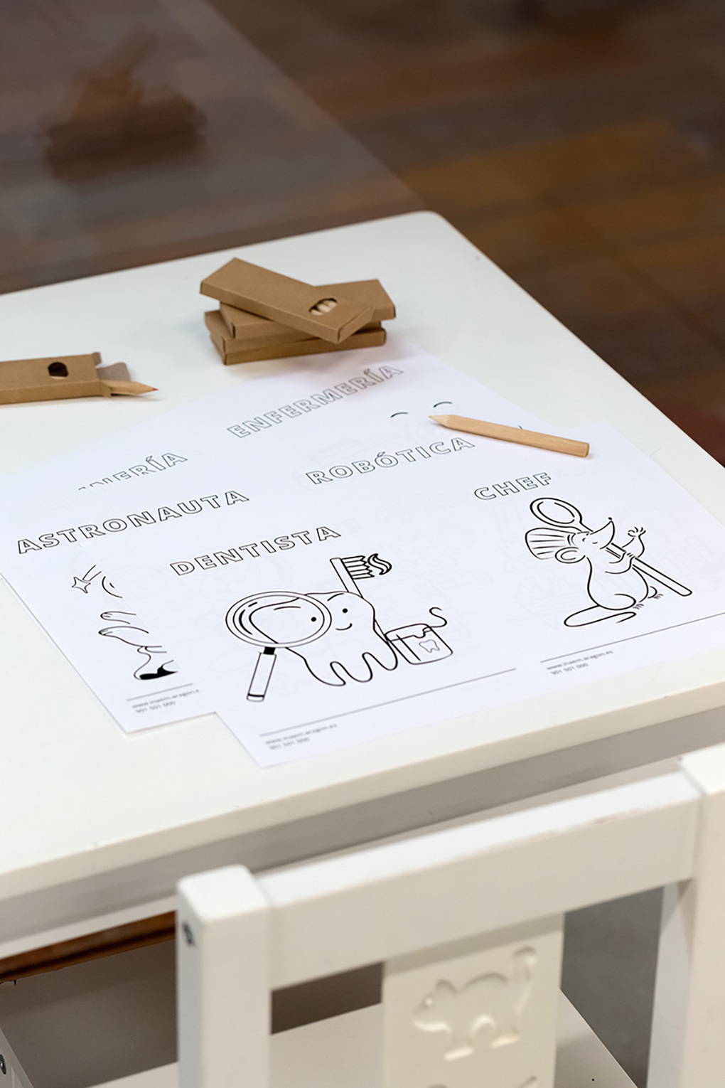 También se generan recursos y materiales específicos orientados a niños y niñas, ya que se detecta que las oficinas presenciales son muy utilizadas por madres, que necesitan un espacio o, al menos, materiales que ayuden a que los peques estén acogidos y entretenidos durante la espera y la atención. Para ello, preparamos materiales específicos, como unas fichas para colorear con temática de oficios y, sello de INAEM.